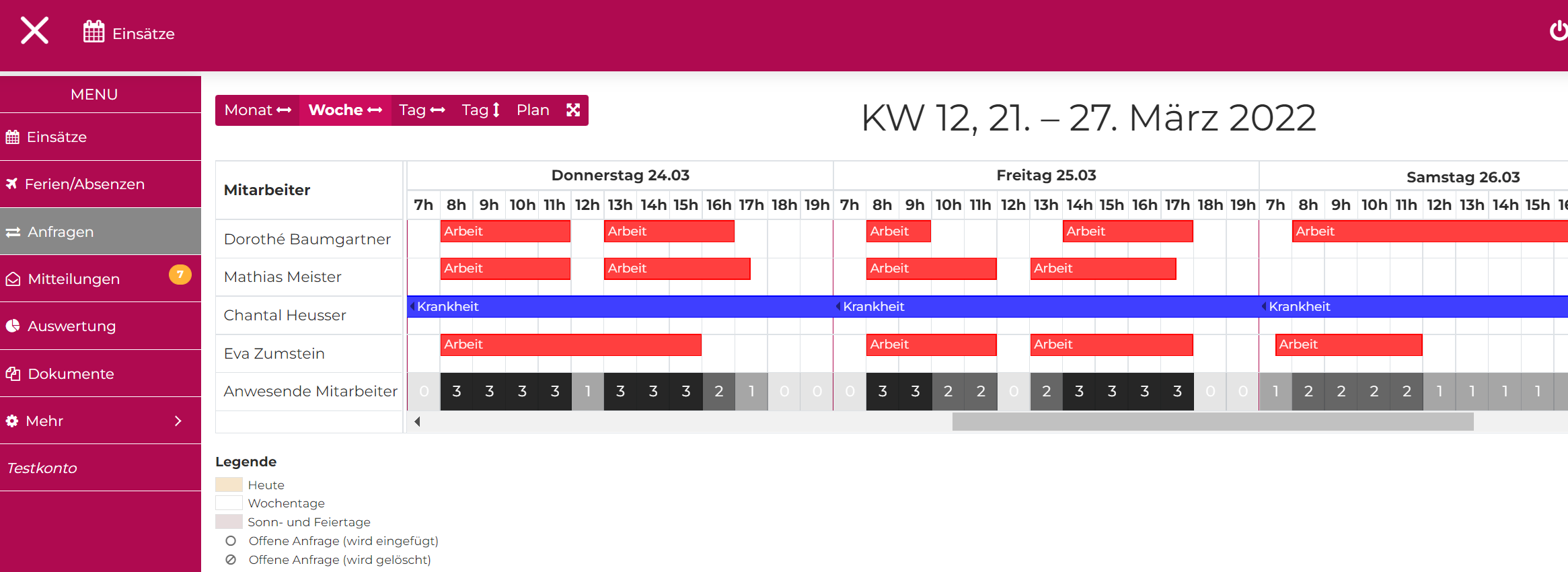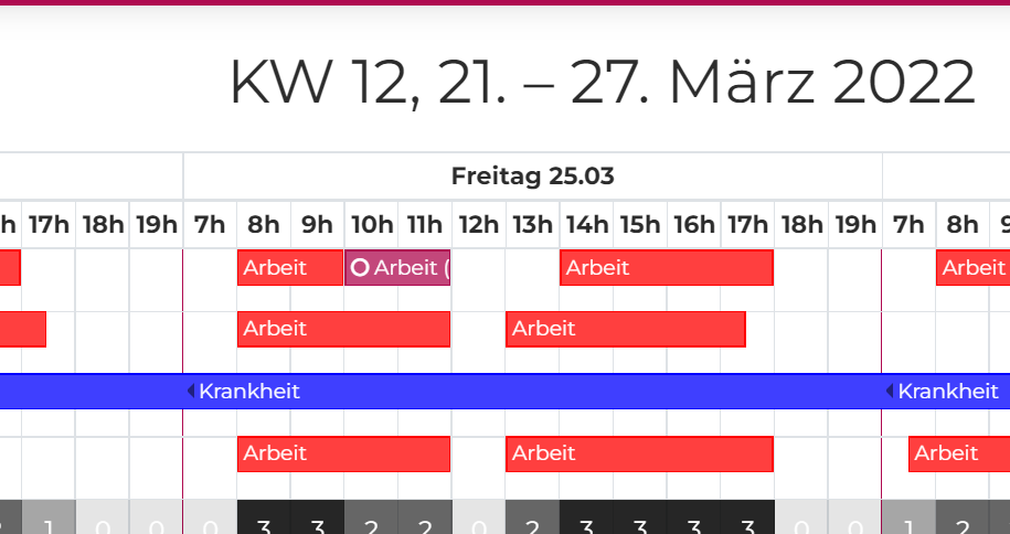 So lange der Admin die Anfrage noch nicht bearbeitet hat, erscheint diese in vieoletter Farbe mit einem o für "offen". Sobald der Admin die Anfrage akzeptiert hat, wird die Farbe der entsprechenden Stundenkategorie verwendet.