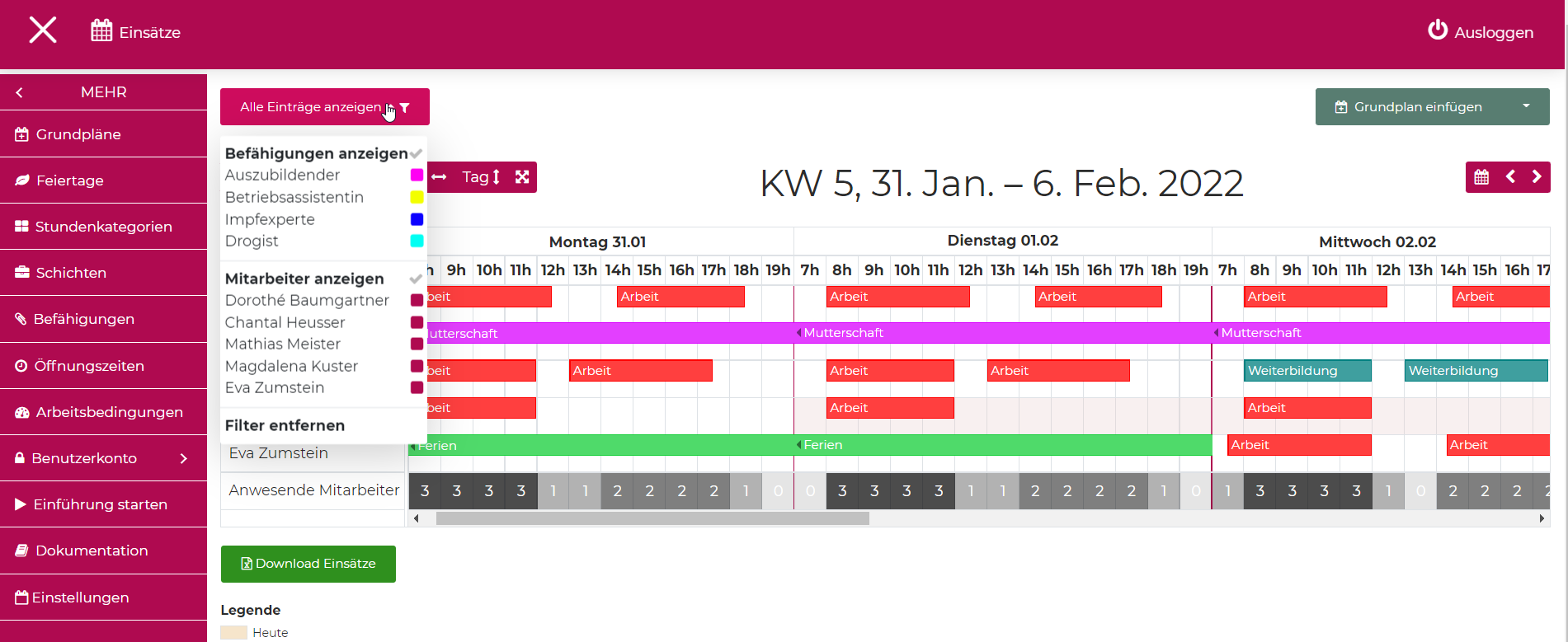 Will man einzelne Befähigungen sichtbar machen, kann dazu oben links ein Filter gesetzt werden und nur die Mitarbeitenden mit diesen Fähigkeiten erscheinen im Plan. Auch können Mitarbeiter (z.B. Raumpfelge) grundsätzlich nciht sichtbar gemacht werden, obschon sie geplant sind.