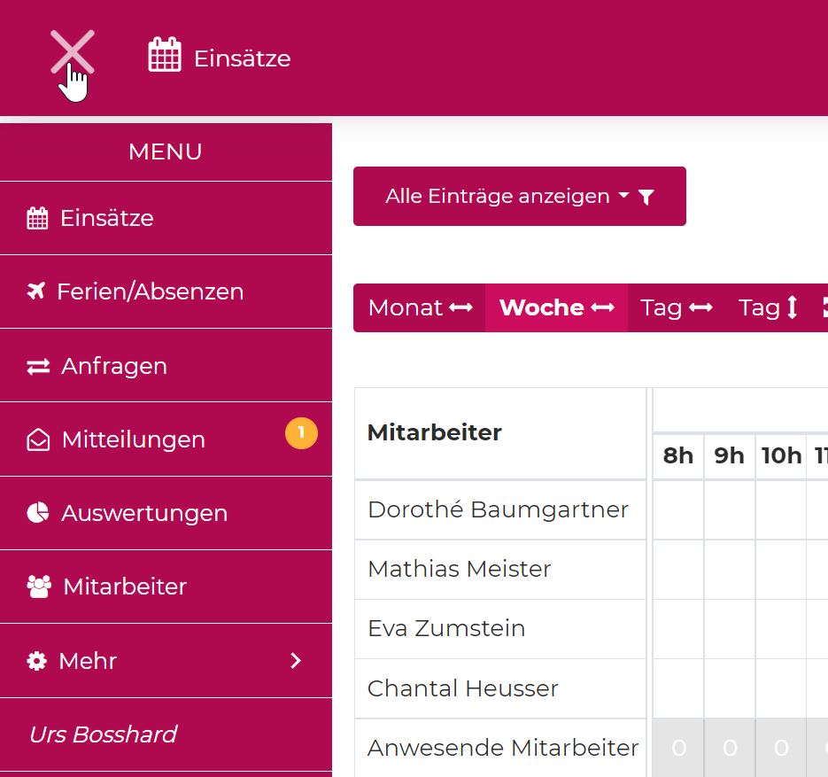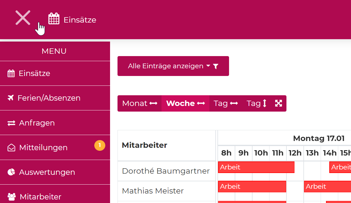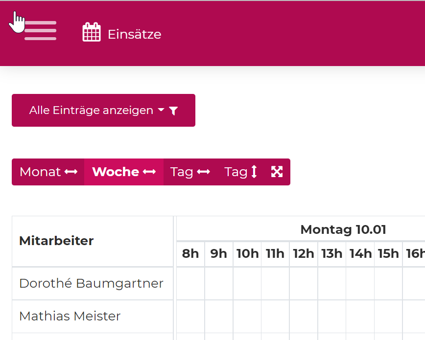 Die Ansicht des Einsatzplanes lässt sich als Monat, Woche oder Tag einstellen. Standarmässig ist eine Woche eingestellt mit Zeitintervallen von einer Stunde. Bei der Tagesansicht sind es 15 min.