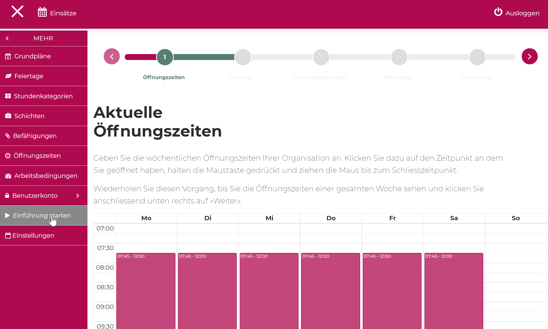 Lorsque vous démarrez Teamplanner pour la première fois, vous êtes automatiquement guidé à travers l'introduction. En cliquant sur "Plus" sur la navigation de gauche, vous pouvez à tout moment relancer l'introduction et ajouter les points manquants. Il vaut la peine de suivre l'introduction de manière rigoureuse afin qu'aucune entrée essentielle ne manque. Dans la navigation horizontale supérieure (heures d'ouverture, jours fériés, conditions de travail...), il est toujours possible de cliquer en avant ou en arrière.
